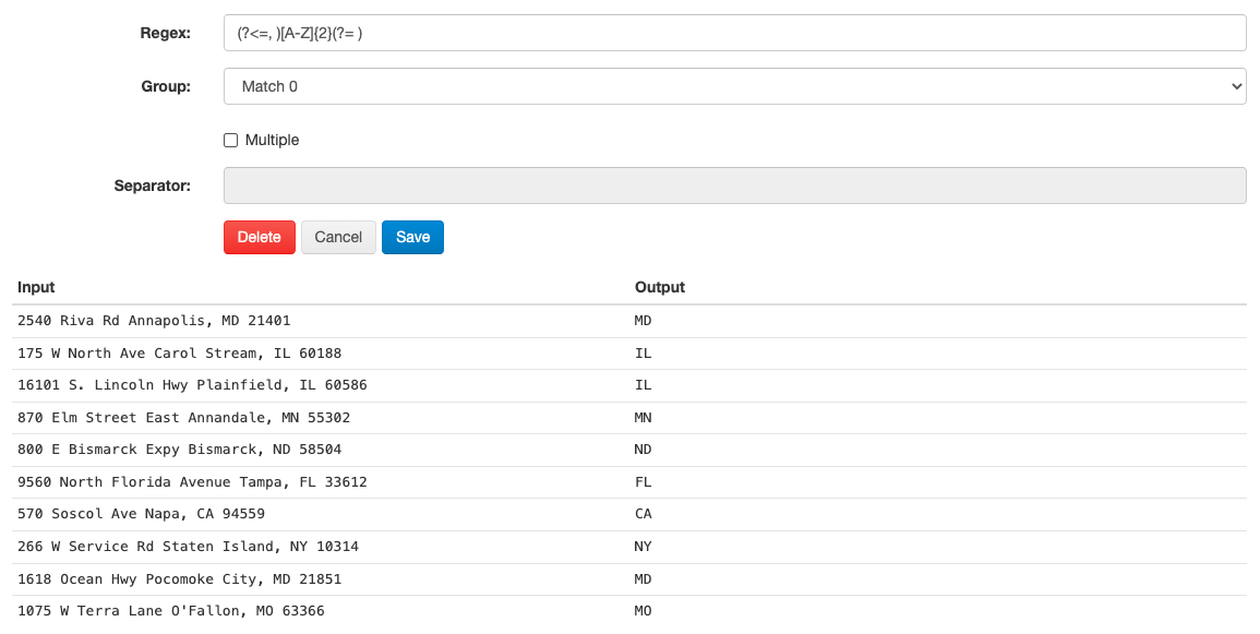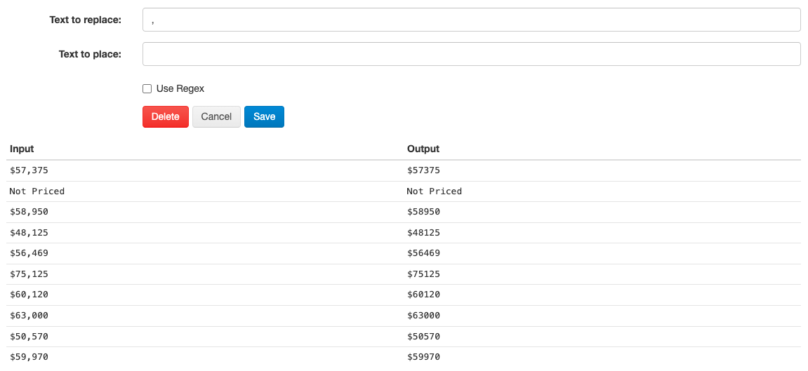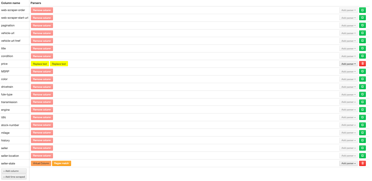 You can then use the parser to edit any columns of data from the web pages you scrape. For example, we use the parser to remove non-numeric characters like “$” or “.” from pricing data through text replacement and also to obtain only the state acronyms from the seller-location address through a regex match.