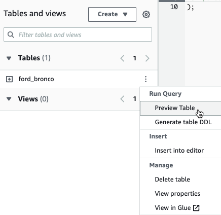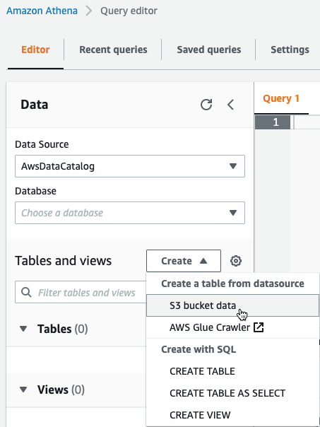 Unless you’re using a special Data Source setup, stick to using the default ‘AwsDataCatalog’. From the Tables and views tab, select Create and choose to create a table from S3 bucket data.